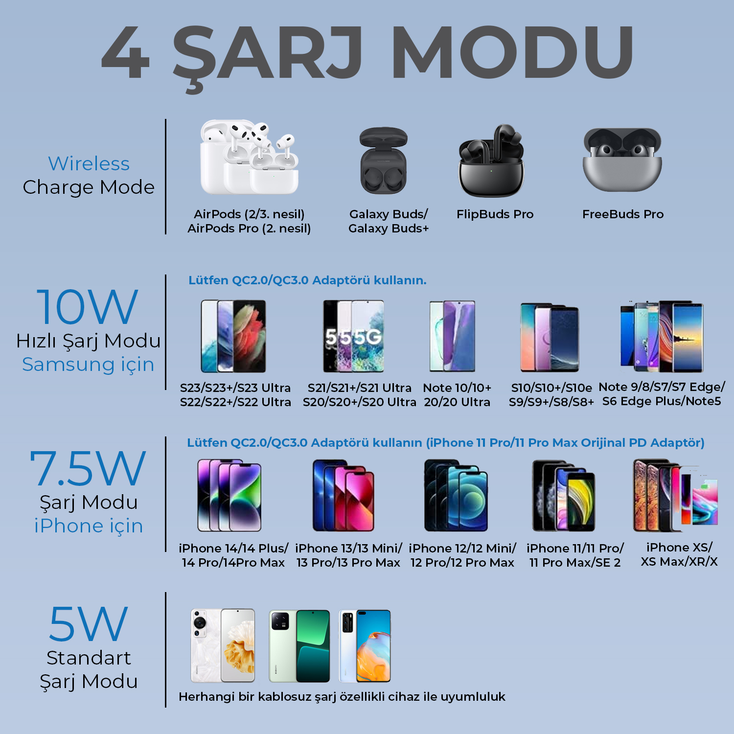 - Uyumluluk: iPhone, Samsung ve kablosuz şarjı destekleyen tüm akıllı telefonlar ve bluetooth kulaklıklar