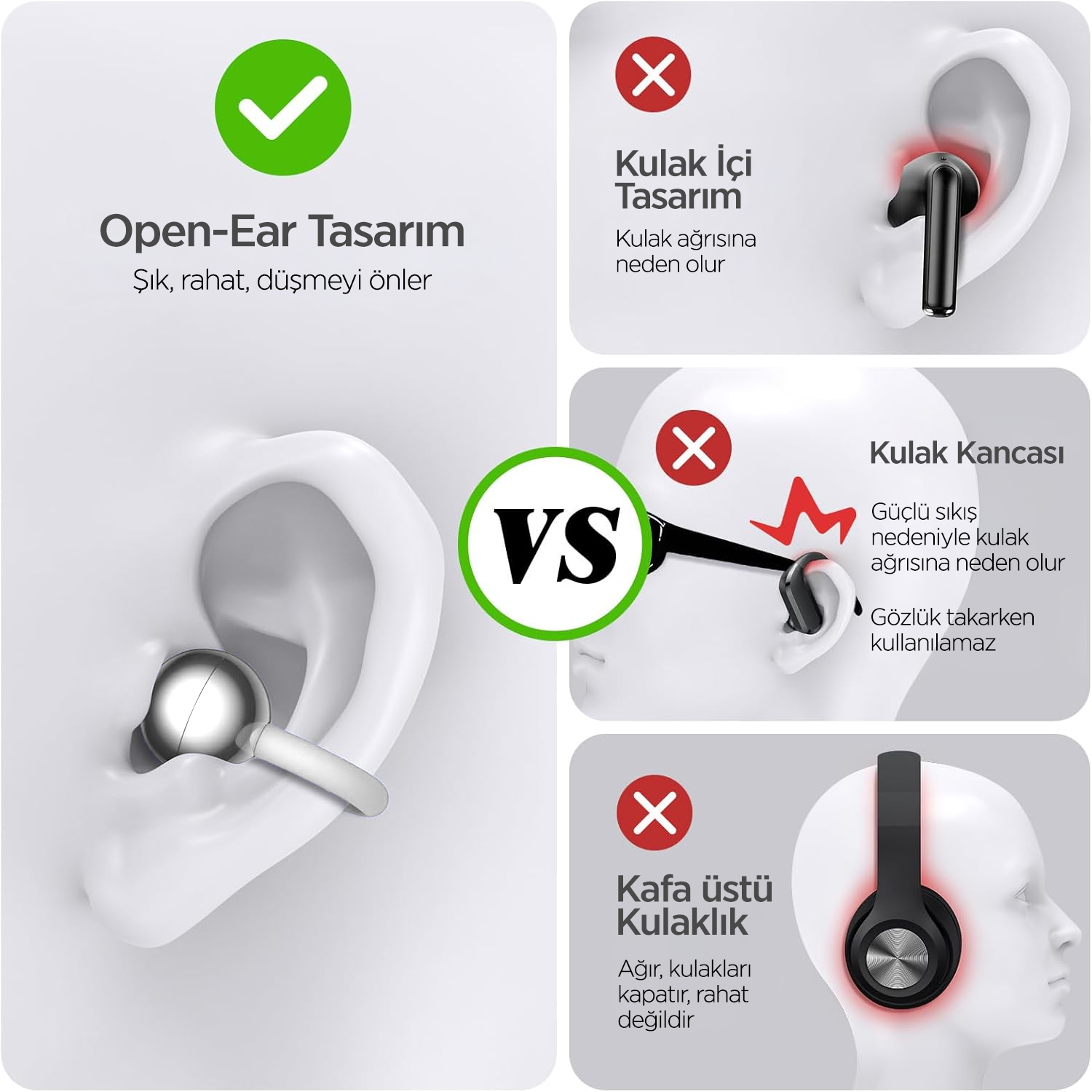 Open-ear yani açık kulak tasarımı sayesinde kulağınızı tamamen kapatmaz. Bu sayede müzik dinlerken ya da telefon görüşmesi yaparken dış sesleri de duyabilirsiniz. Özellikle yürüyüş, koşu ve bisiklet gibi açık hava aktivitelerinde güvenli kullanım imkânı sunar. Ultra hafif yapısı sadece 34 gramdır, uzun süre kulağınızda kalsa bile rahatsızlık hissi vermez. Gün boyu rahatlık arayanlar için ideal bir kulak içi kulaklıktır.