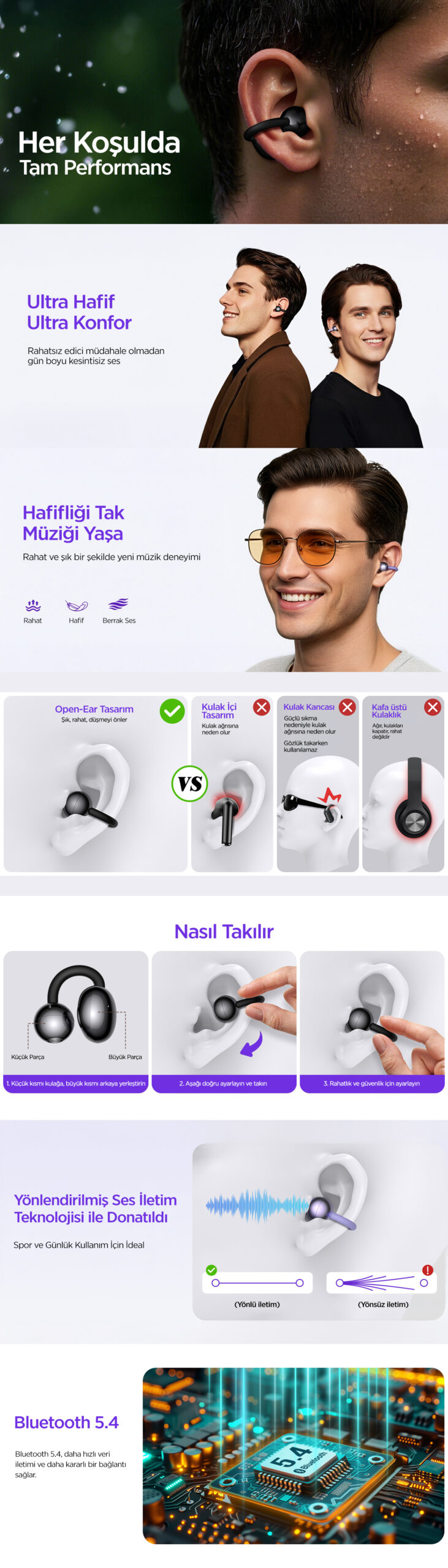 Open-ear yani açık kulak tasarımı sayesinde kulağınızı tamamen kapatmaz. Bu sayede müzik dinlerken ya da telefon görüşmesi yaparken dış sesleri de duyabilirsiniz. Özellikle yürüyüş, koşu ve bisiklet gibi açık hava aktivitelerinde güvenli kullanım imkânı sunar. Ultra hafif yapısı sadece 34 gramdır, uzun süre kulağınızda kalsa bile rahatsızlık hissi vermez. Gün boyu rahatlık arayanlar için ideal bir kulak içi kulaklıktır.