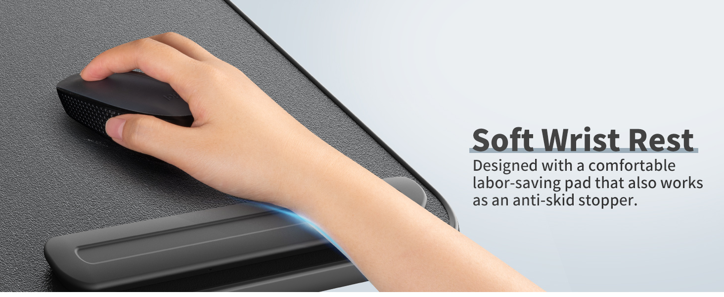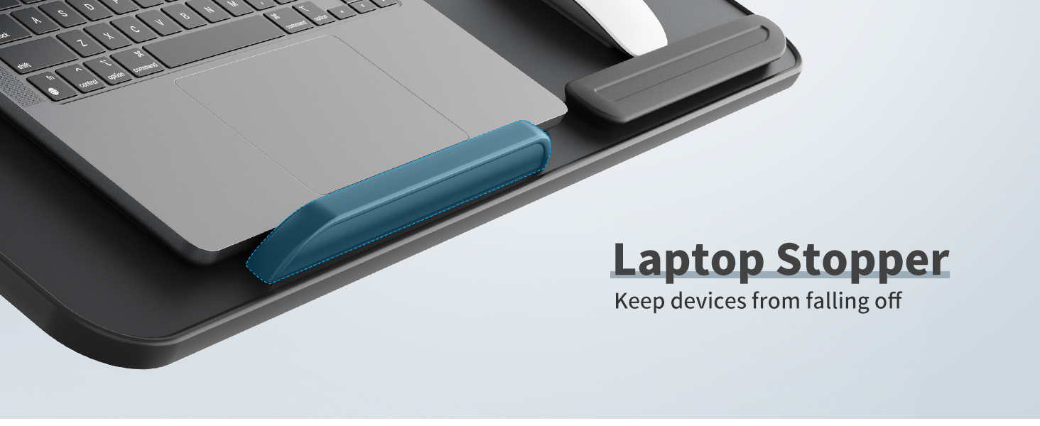 Bu modelde yer alan çıkarılabilir laptop stopper, eğimli açılarda cihazınızı sabit tutarak kaymayı önler. Aynı zamanda tabla üzerinde bulunan yumuşak silikon bilek desteği, uzun süreli mouse ve klavye kullanımında bilek konforu sağlar. Hem güvenli hem ergonomik bir çalışma yüzeyi oluşturur.