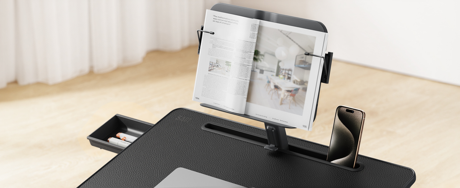En önemli özelliklerinden biri, 11.8″–18.8″ genişliğe kadar açılabilen, 90°’ın üzerine çıkabilen büyük kitap standıdır. Hem kitap hem tablet hem de doküman kullanımını destekler. Metal sayfa tutucular okumayı kolaylaştırır ve sayfaların kapanmasını engeller. Masa eğimli olsa bile kitap standı sabit kalır.