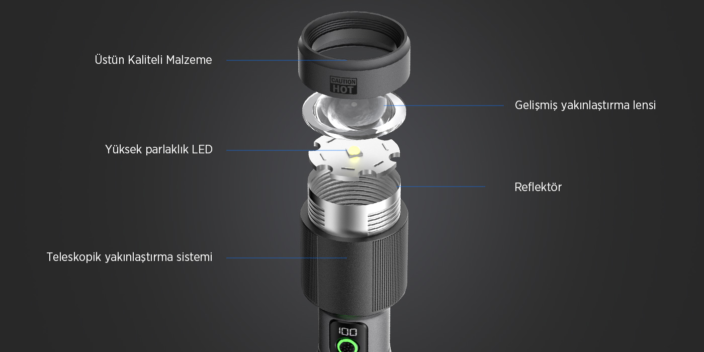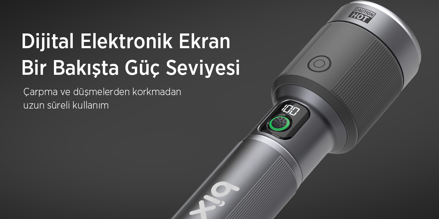El fenerinizin üzerinde bulunan güç göstergesi, pil seviyesini anlık olarak takip etmenize olanak tanır. Sahip olduğu LED ekran, %0-100 güç seviyesini gösterir.