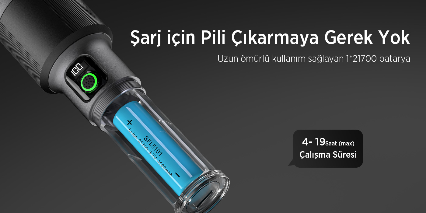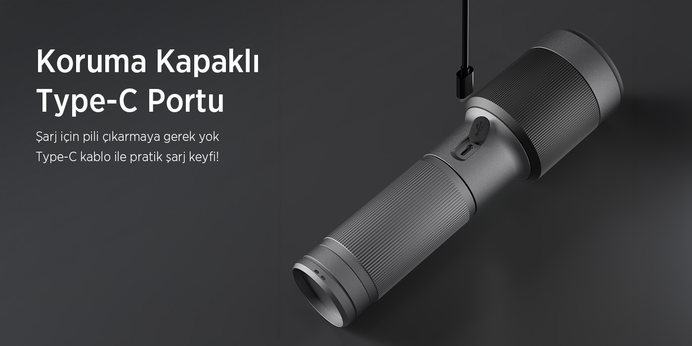 El feneri, sahip olduğu 60W LED gücüyle max. 2300 lümen’e kadar parlaklık sunar ve 850 metreye kadar geniş bir alanı aydınlatabilir. Kompakt tasarımına rağmen güçlü bir performans sergileyen ürün, 4 saatten 19 saate kadar değişen çalışma süreleriyle uzun ömürlü bir kullanım sağlar. Yaklaşık 4-5 saat içinde tamamen şarj olan el feneri, USB Type-C bağlantısıyla hızlı ve güvenli bir şarj deneyimi sunar. Boyutları, taşınabilirlik ve ergonomi açısından idealdir. 60mm baş çapı, 44mm gövde çapı ve 213mm uzunluğu sayesinde hem ele rahat oturur hem de kolayca taşınır. Bu sağlam yapı, dış mekan aktivitelerinden günlük kullanıma kadar her durumda üstün koruma sağlar. Darbelere karşı dayanıklı tasarımıyla sizi yarı yolda bırakmaz!